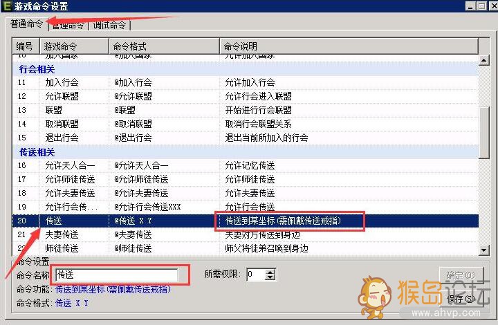 传送戒指的命令默认是 @move 我们可以通过游戏引擎M2 选项→游戏命令→普通命令→ 找到传送戒指的命令项,在命令名称处填入我们自己想要设定的命令,确定→保存即可修改传送戒指的默认命令。