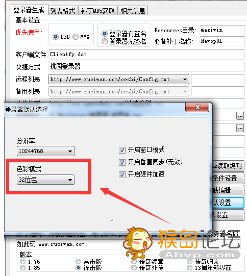 我们选择打开登录器找到。“登录器默认设置”选择1024*768分辨率,在选中32位彩色即可!